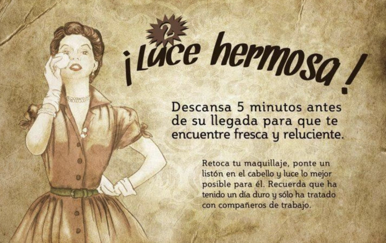To go back to my dear patriotic examples, this idea reminds me of a 1953 manual taught to young women in Francoist Spain, courtesy of Pilar Primo de Rivera, highest ranking girlboss in Spain's equivalent to a sort of rebranded female Hitler youth. It's called Manual de la buena esposa (The Good Wife's Handbook), an offensively kitschy read trying to imitate Americana as ineptly as Spanish culture has always been at trying inauthenticity.